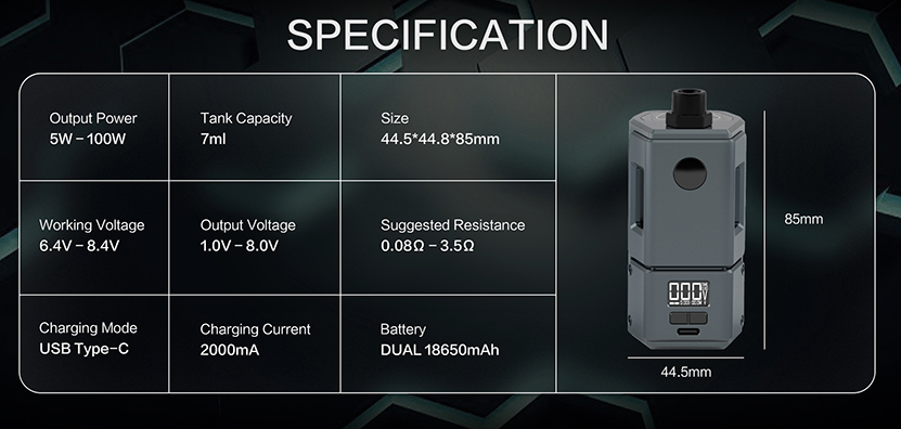 Ethos Boro Kit is the Dual Battery Boro AIO Kit that gives a ultimate solution to the common issue of short battery life in Boro devices. It is powered by dual 18650 batteries, which not only extends periods of vaping time, but also brings the wide power range of 5W-100W. Besides, It also comes with an appropriate size to ensure comfort while holding in hand. The fire button is located on the door that holds the tank. The tank has 7ml capacity, and can work with sub-ohm coils, or any DIY bridge of your choice. It is also compatible with PnP coils and GTX coils. A RBA deck and a Sub-Ohm coil deck are included in the package. DOVPO Ethos Boro Kit supports POWER, VOLTAGE, TEMP-NI, TEMP-SS, TEMP-TI modes. Multiple safety protections are designed to ensure your safety, such as reverse polarity protection, no-load protection, short-circuit protection.