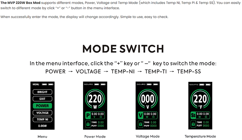 MVP Box Mod is powered by dual external 18650 batteries with 5W-220W power. It has Power/Voltage/Temp Mode for your option. It also features 0.96 TFT screen and Type-C charging. DOVPO MVP Mod supports tanks from 0.07Ω to 3.5Ω resistance.