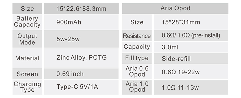 | Coil | Aria 0.6 Opod 0.6Ω(19-22w), Aria 1.0 Opod 1.0Ω(11-13w) |