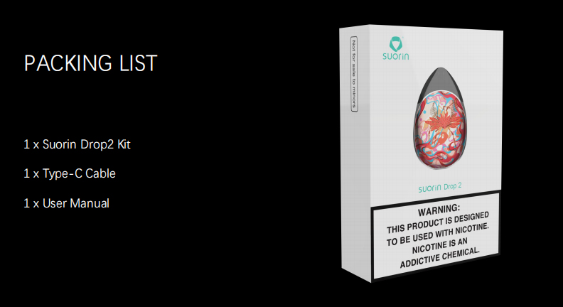 The package of Suorin Drop 2 Pod System Kit Comes With: