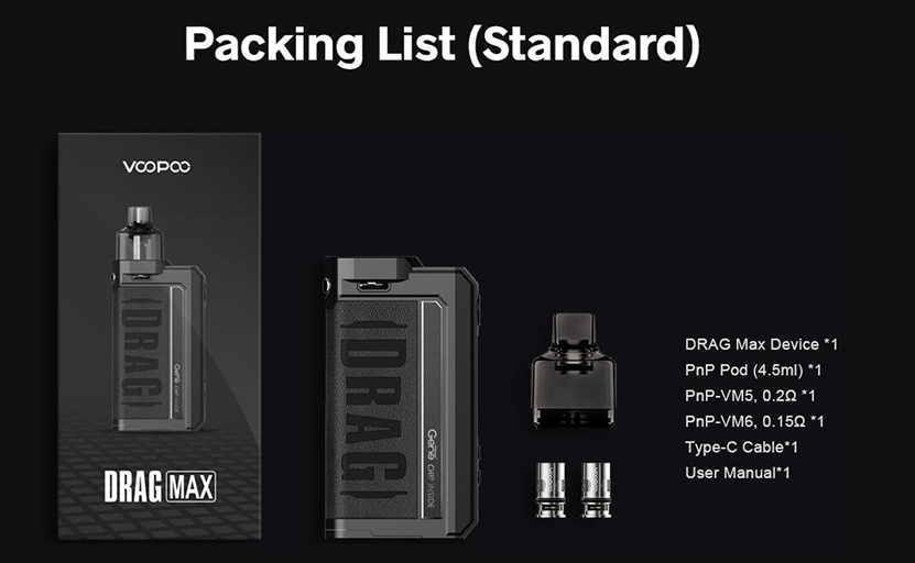 Drag Max Kit is a epochal dual-battery device with magnetic atomizer. It is powered by dual 18650 batteries with 5-177W power range. Made by metal and leather, it is tough and gentle. The brand newly upgraded GEME.FAN 2.0 chip gives Drag Max some innovative functions, such as 0.001s extreme ignition, dynamic stable output, intelligent interactive. It comes with two different styles UI themes, you can enjoy the two themes with a 1.08 inch TFT color screen. In addition, Drag Max provides two modes to fit different needs of vaping: easy-to-use SMART mode for beginners, power-free RBA mode for professional vapers. It has a universal compatibility of atomizer: PnP Pod, PnP MTL Pod, PnP RTA Pod and you can use the one you like with Drag Max. It is also compatible with all PnP Coils. The capacity is 4.5ml.
