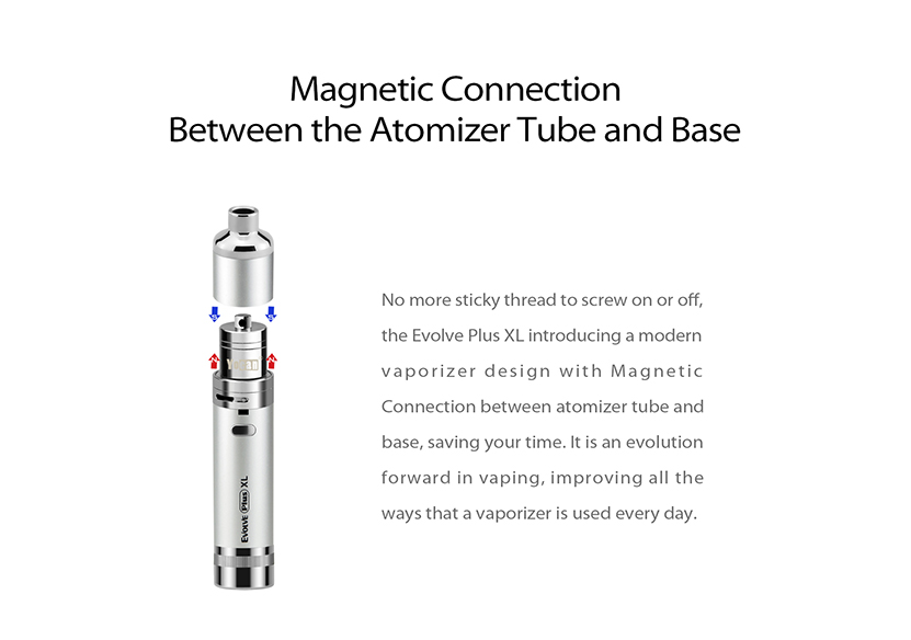Evolve Plus XL Kit is featuring a strong 1400mah battery, which can power up for long time vaping. And it can be charged via Micro USB port. The kit comes with compact design and small size to perfectly fit in the palm of your hand. The atomizer has bottom airflow control design for free adjustable. It is compatible with unique QUAD coil technology for giant clouds and hits, perfect for cloud chasers which is hard to come by. The magnetic connection between the atomizer tube and base will save time for vaping.